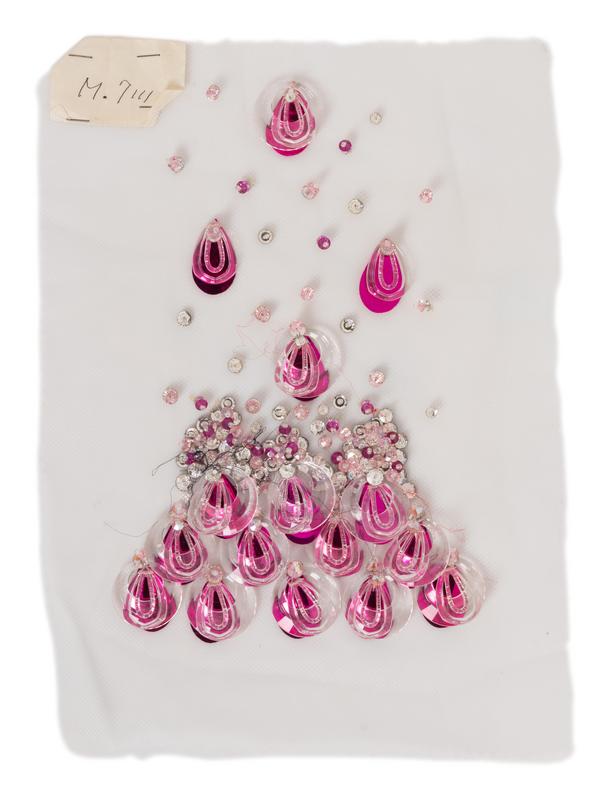 The tenth is made of pink and clear plastic teardrop sequins with pink and silver beads and faceted jewels. Paper label: M. 7111