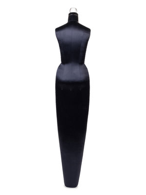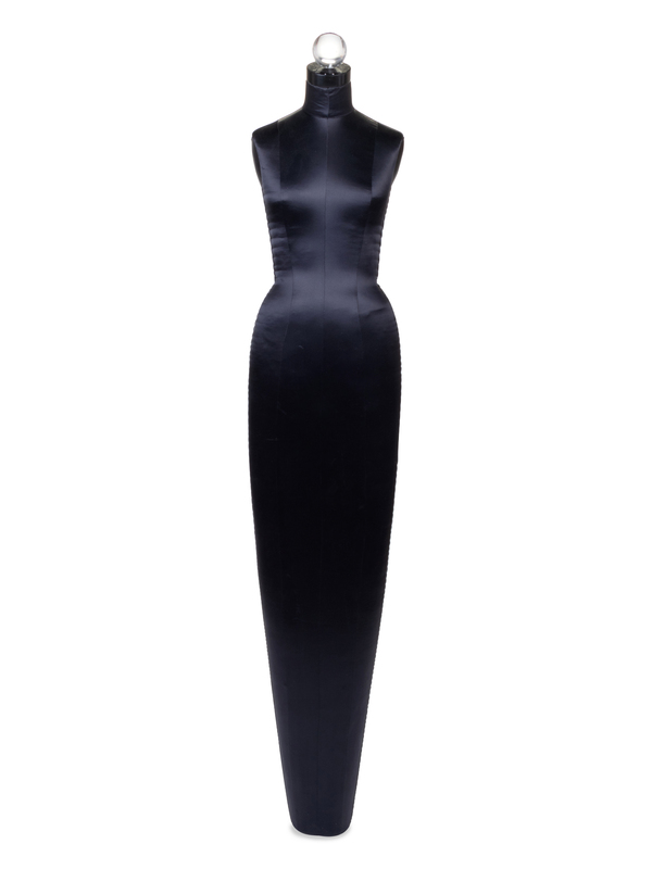 Black satin covered mannequins with elongated shape and with a clear, removable sphere neck cap. The mannequin stands on its own without a base.
