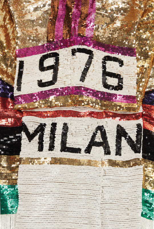 The Second: White with multi hued sequin jersey with multi colored sequin stripes across the front and "Milano" on the right sleeve.