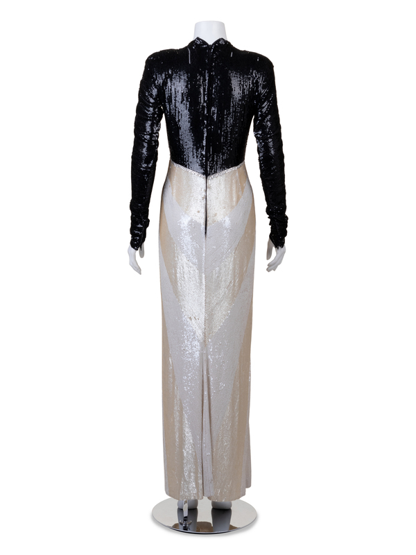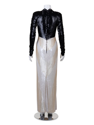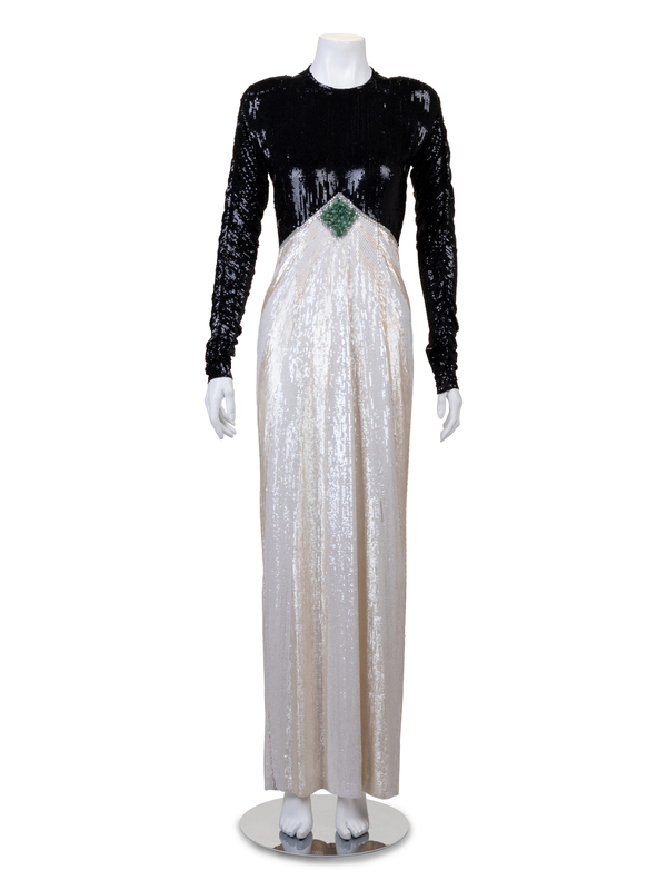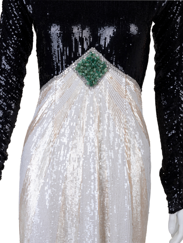 Sequined long dress with bodice embroidered with small black sequins, the long skirt with white, the pointed waist ornamented with a diamond shape of mottled green beads and edged in rhinestones.
