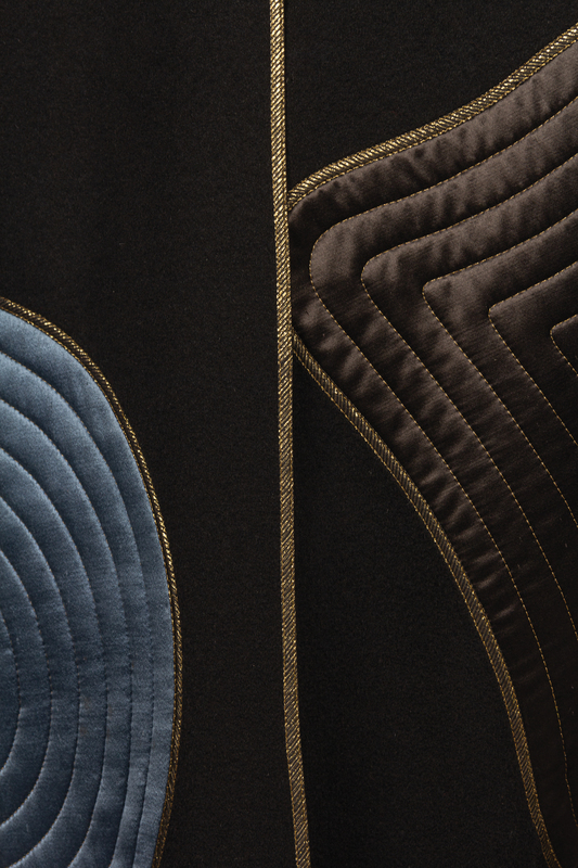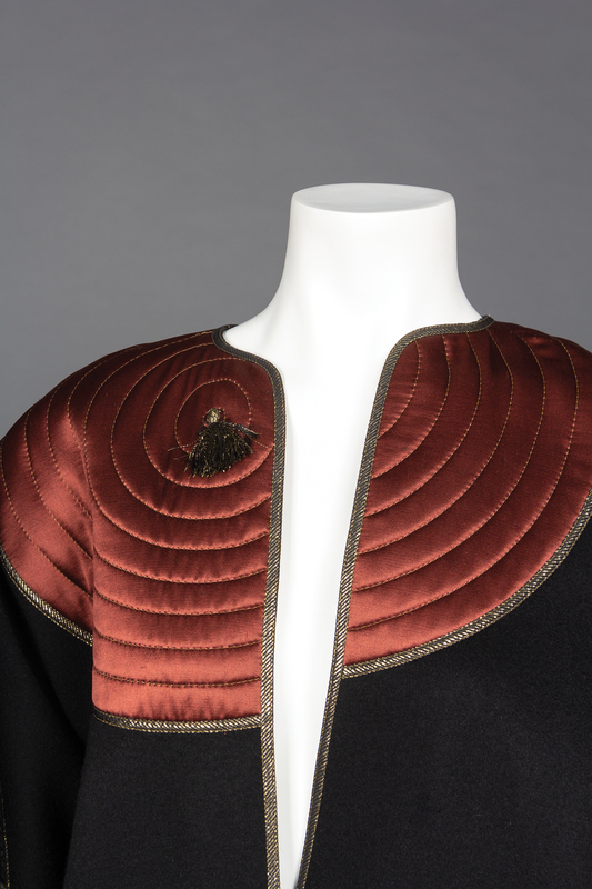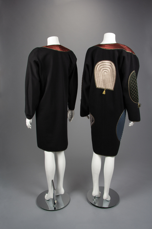 This ensemble consists of a dress and coat of black wool with multi-hued quilted satin applique and metallic thread trim with tassels. The dress is a pull over and the coat has no closure and is reversible.