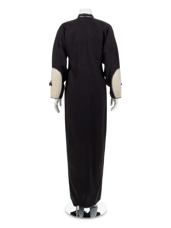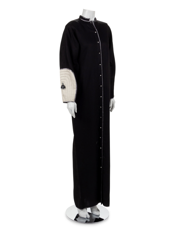 Black linen dress with quilted white crepe satin patches on lower sleeve, tassels, and rhinestone buttons.