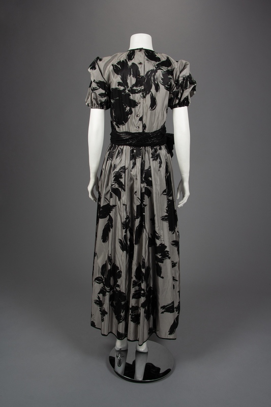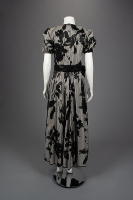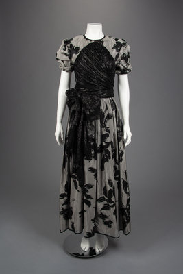 Gray taffeta evening dress with black floral print and black crepe draped bodice.