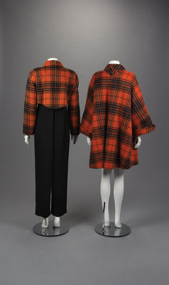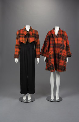 The First: Black wool jumpsuit with orange and black blanket plaid wool cropped jacket.