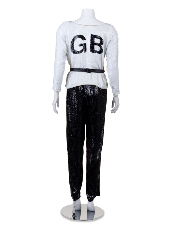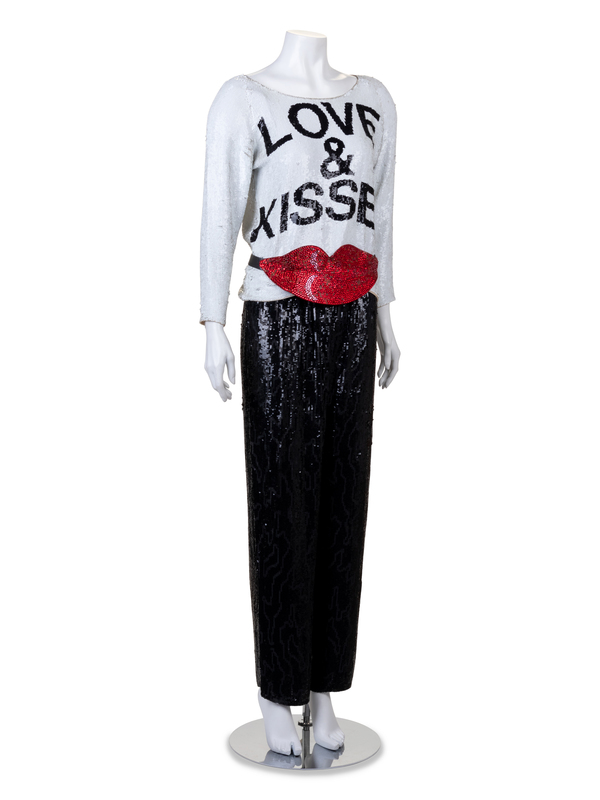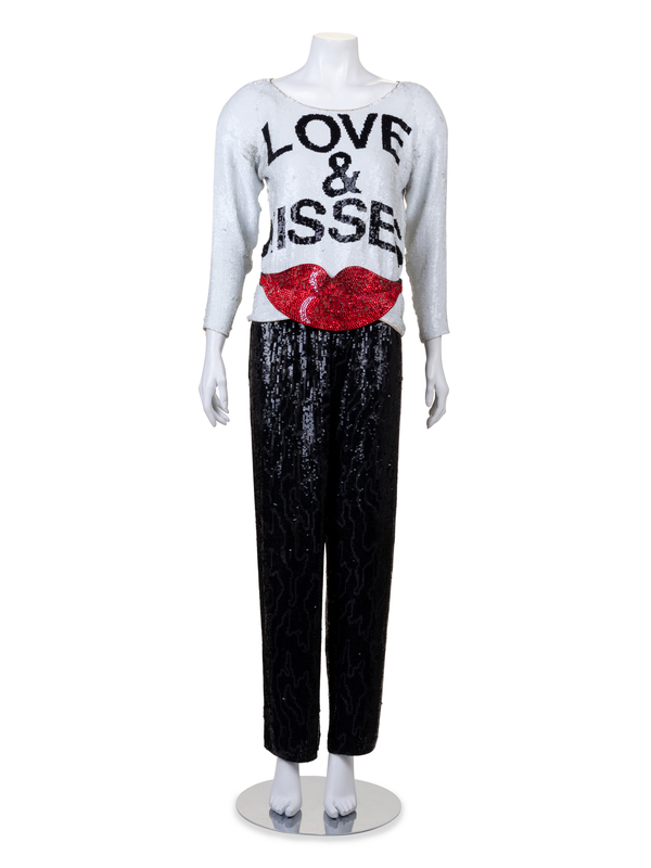 Top is covered in white sequins with the words 'Love & Kisses' on the front and 'GB' on the back in black sequins. Pants are made with black sequins with a 'moire' pattern and the 'lips' belt is covered in red plastic rhinestones.
