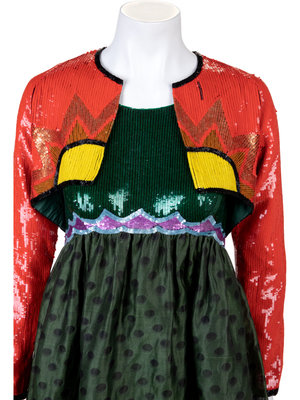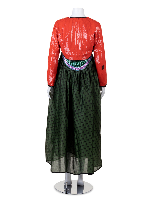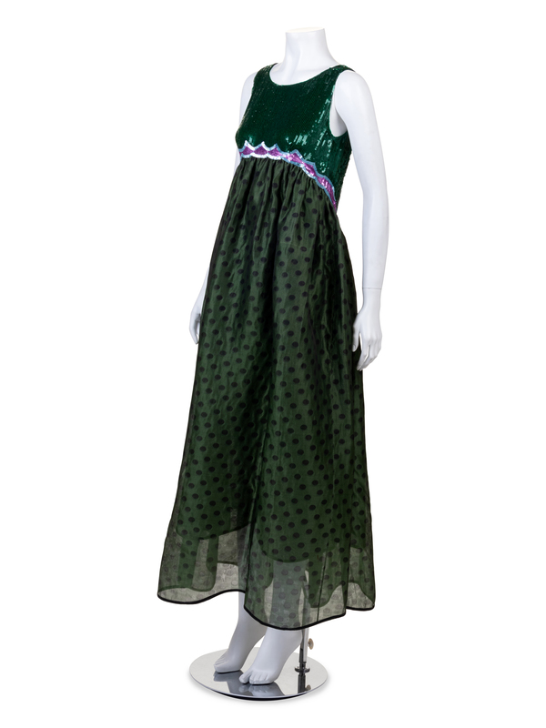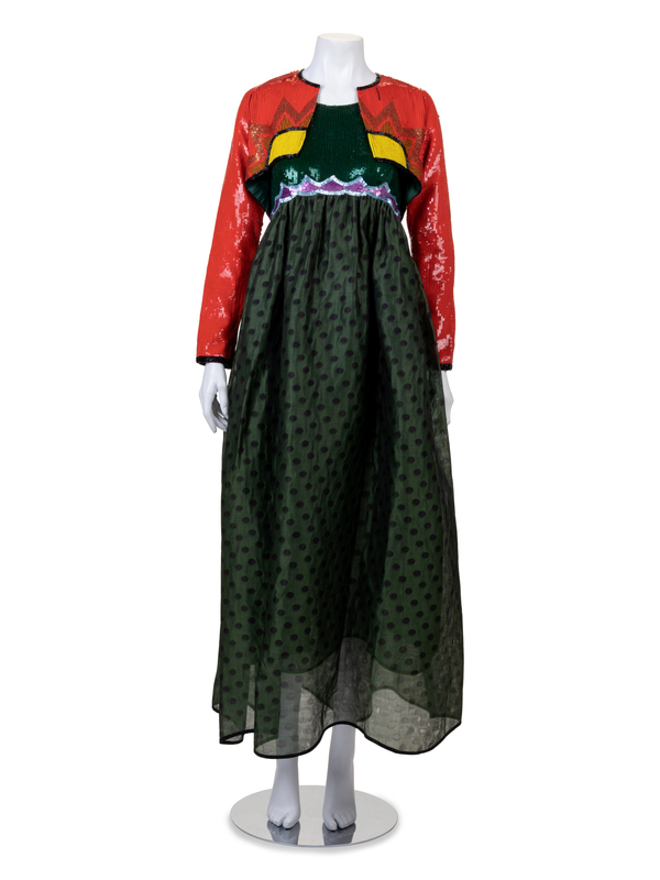 Evening dress and bolero ensemble consisting of an empire waist dress with a skirt of olive silk woven with black shadow dots and the high-waisted bodice embroidered with green sequins and with scalloped bands of orchid and pale blue sequins. The bolero is