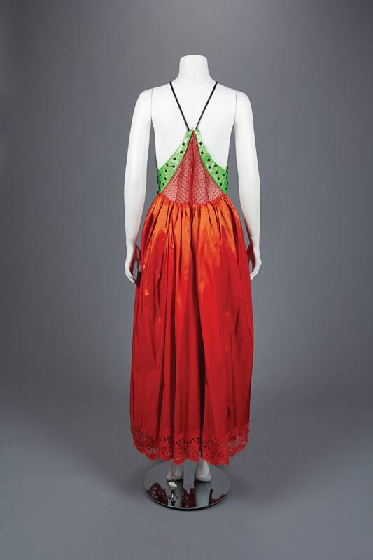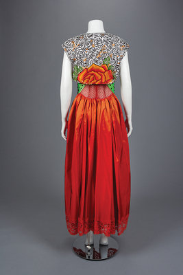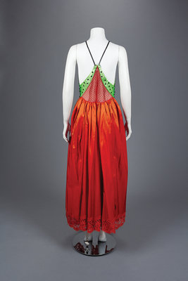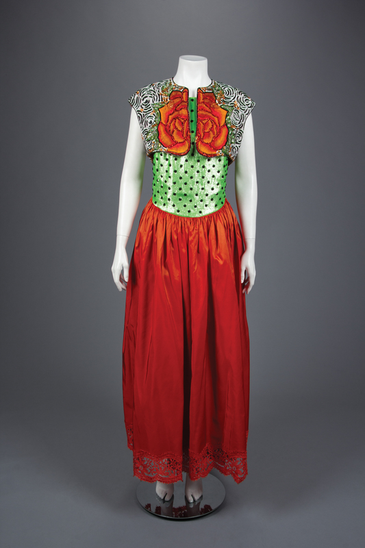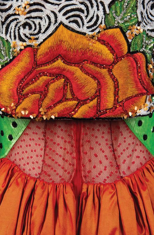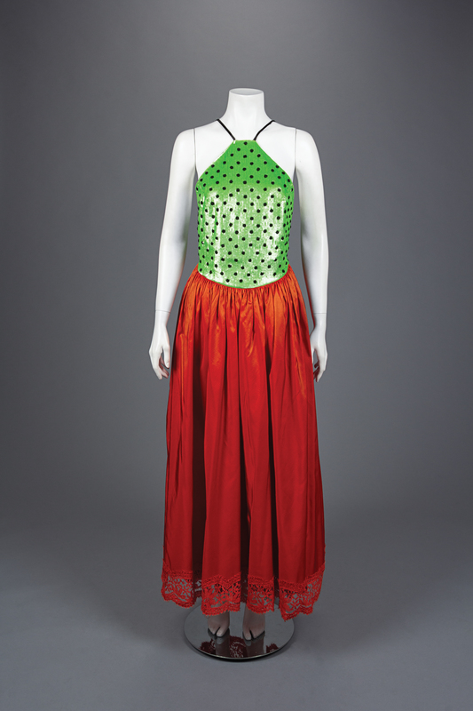 Green and black sequined halter bodice with gathered red orange silk taffeta skirt trimmed in lace, center back zipper closure, and floral embroidered, sequined, and beaded bolero jacket.