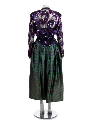 Strapless dress with sequin bodice and full green plaid skirt. The black lace bolero is embroidered with large purple sequins.