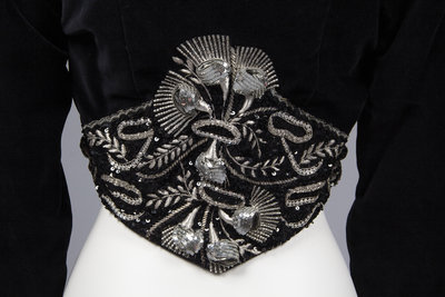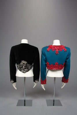The First: Turquoise wool bolero with red lace, beads, and rhinestones around neckline, back yoke, and cuffs.