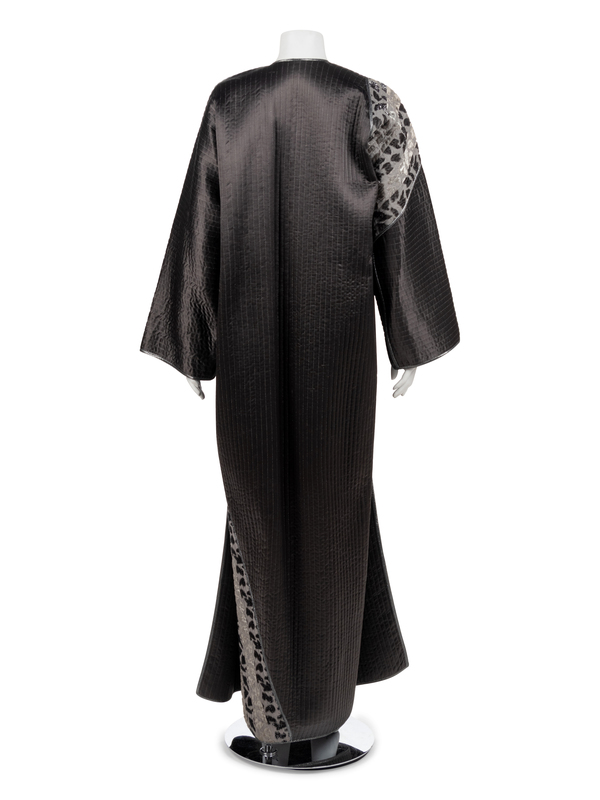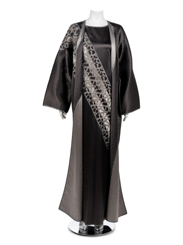 Gray satin dress with diagonal strip of grey and black voided velvet. Long quilted grey coat with light grey interior. Dress has thin shoulder straps.