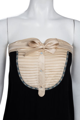 The Third: Black and ivory strapless dress with black mohair jacket trimmed with gold fabric.