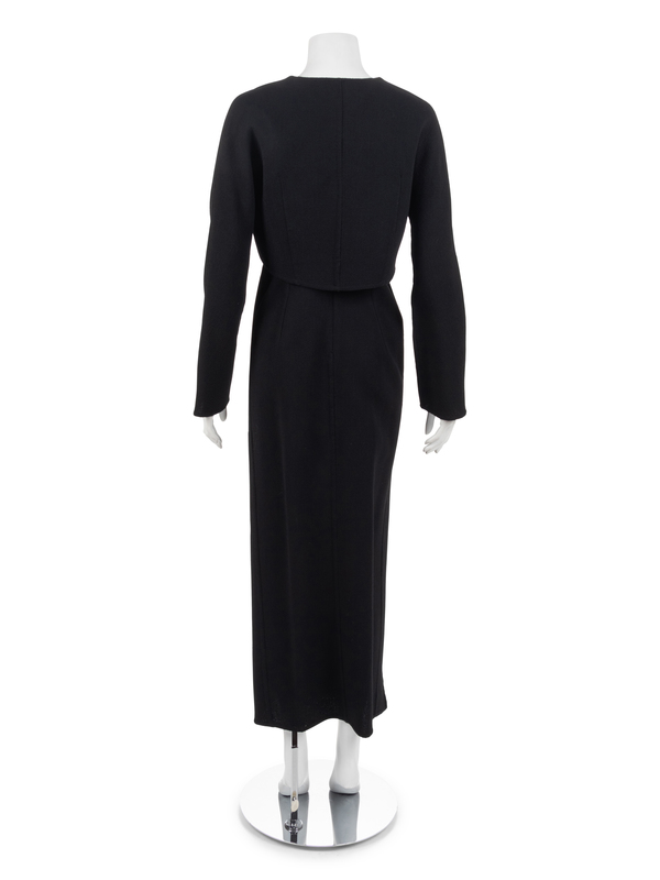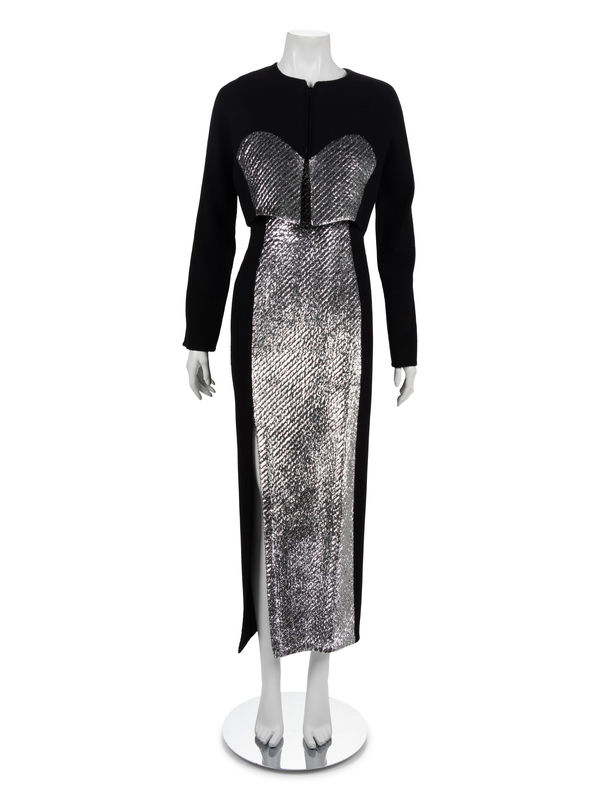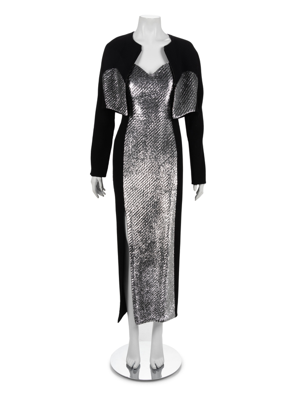 Black wool crepe and silver panne velvet ensemble. Dress has this shoulder straps. Bolero jacket has a center front zip closure.