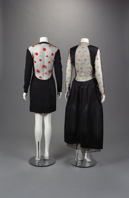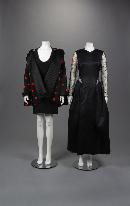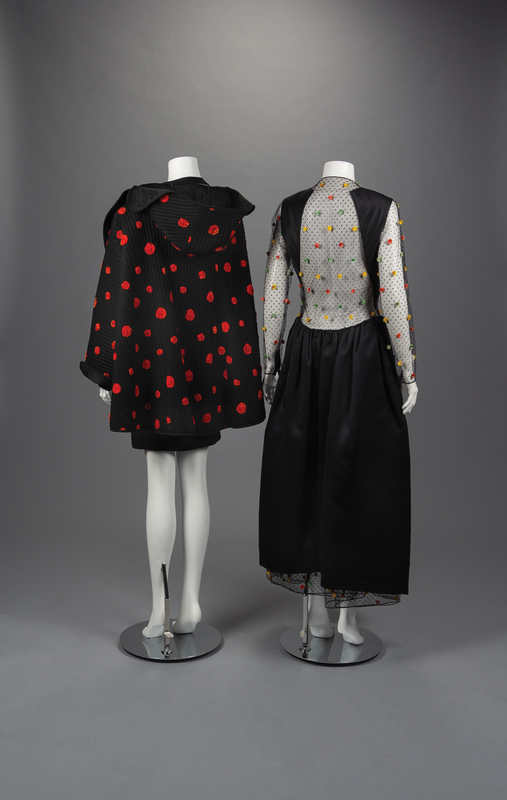 The First: Short black wool crepe evening dress with deep scoop neck, long sleeves, center front zipper closure, and black net with orange chenille polka dot detail on back bodice. The accompanying quilted coat is black satin with net overlay of orange chenille polka dot detail, and hood.