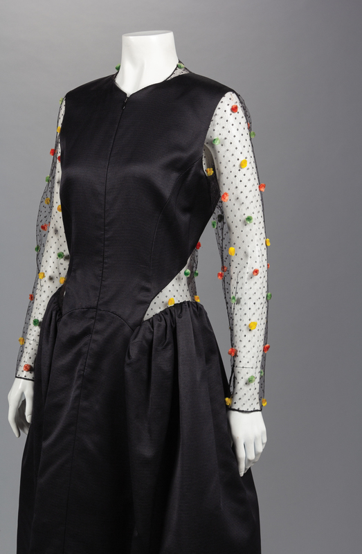 The Second: Black silk ottoman evening dress with full skirt, center front zipper closure, and point d'esprit sleeves with multi hued pom-poms.