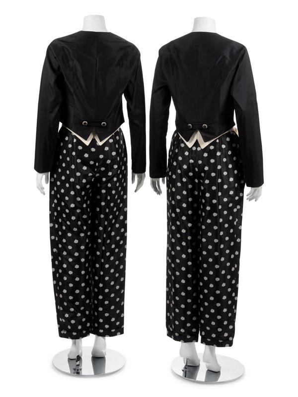 The Second: Black silk ribbed taffeta jacket with black and rhinestone buttons, black with white floral print taffeta trousers, and white tie on belt.