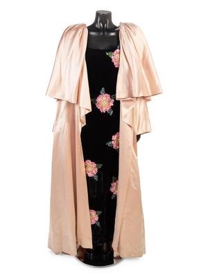 The ensemble includes a soft pink satin tiered opera cape and a black velvet dress with embellished floral pattern.