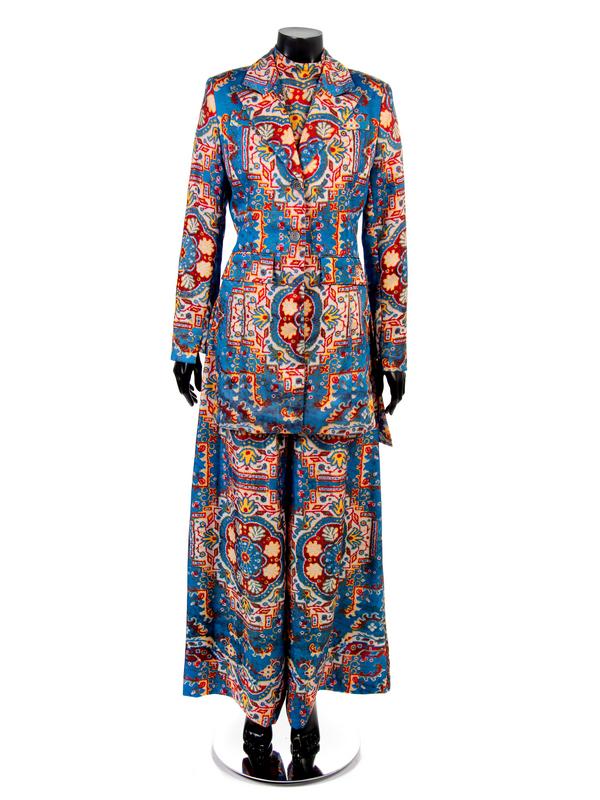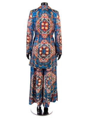 This ensemble includes a multi-hue printed three-piece suit with a long notch lapel jacket, knit mock-neck blouse, and wide-leg trousers.