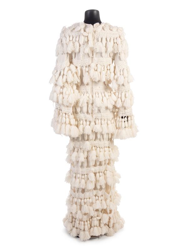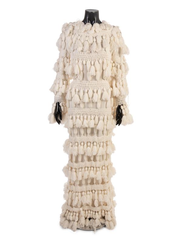 White crepe dress with long flared sleeves, scoop neckline, long straight skirt. Dress is embellished white crocheted yarn and white sequins in horizontal rows with tassels.