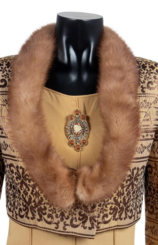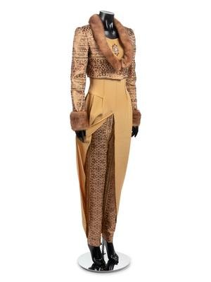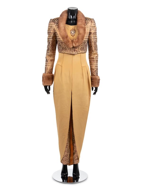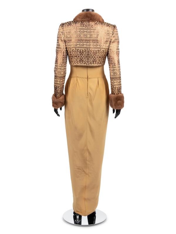 Gold thread jacquard fur trimmed crop jacket with high-waist trousers and gold satin high slit dress. 1990-2000s.