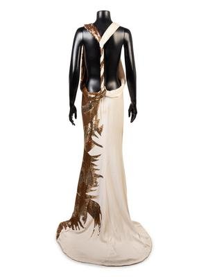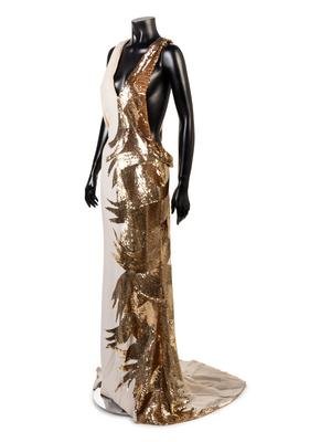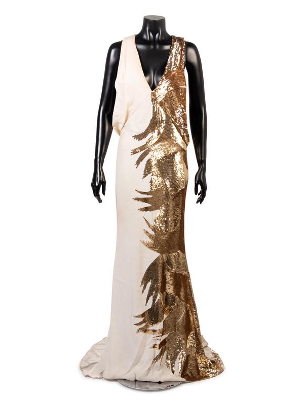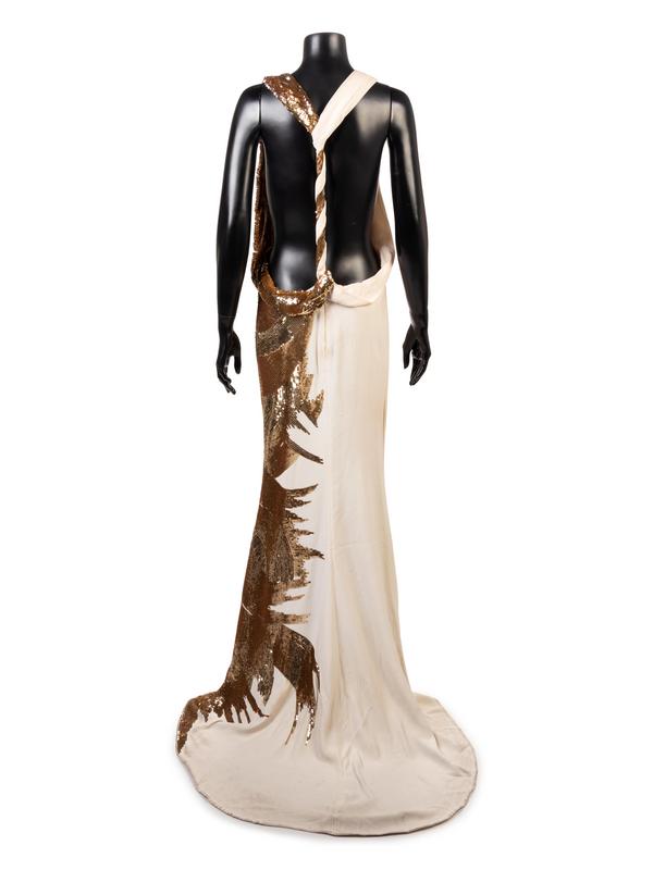 White crepe with goldtone sequin embellished evening dress with twisted back bodice.