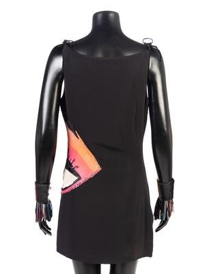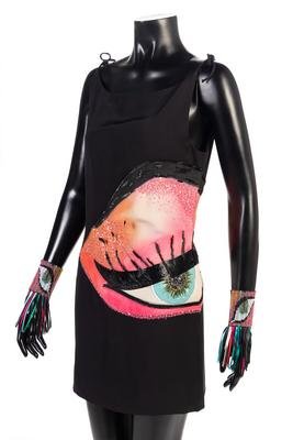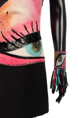 Hand-painted black silk faille with "eye" styled embroidery of beads, sequins, and feathers. Paired with matching beaded cuff.