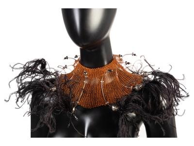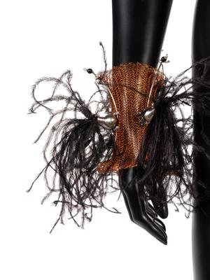 -Orange wire and black ostrich feather, two cuffs and one necklace