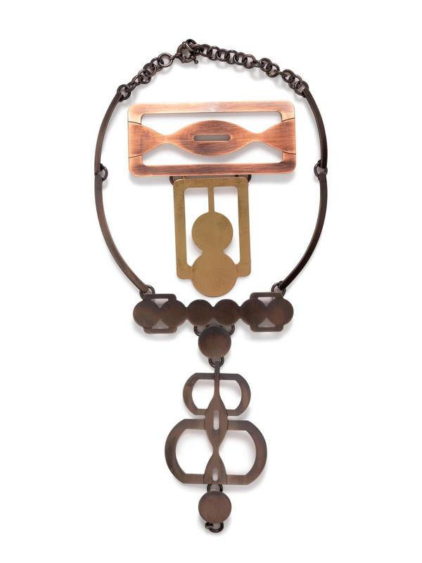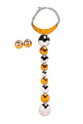 -Long necklace made of copper and silvertone discs, which hang down the center front and closes around the neck with a chain. With matching earrings.