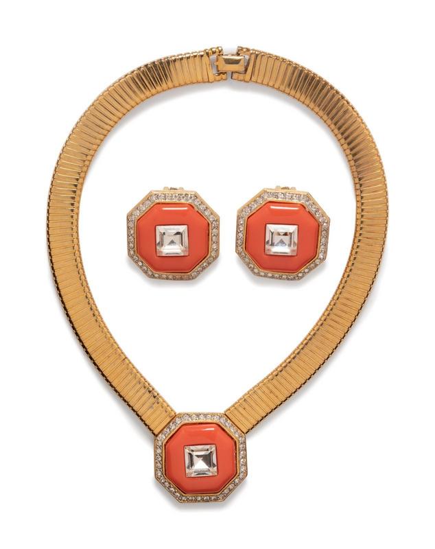 -Kenneth Lane Gold toned choker with rhinestones and melon toned enamel and matching earrings