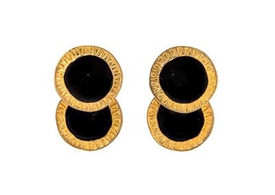 -Pair of double round goldtone with black enamel earrings with triangle edge detailing