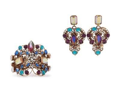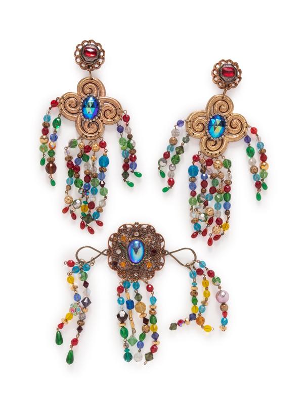 -One set of antique gold metal earrings with multifaceted rhinestones