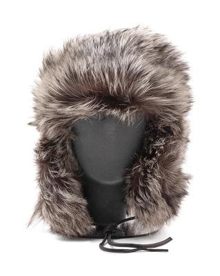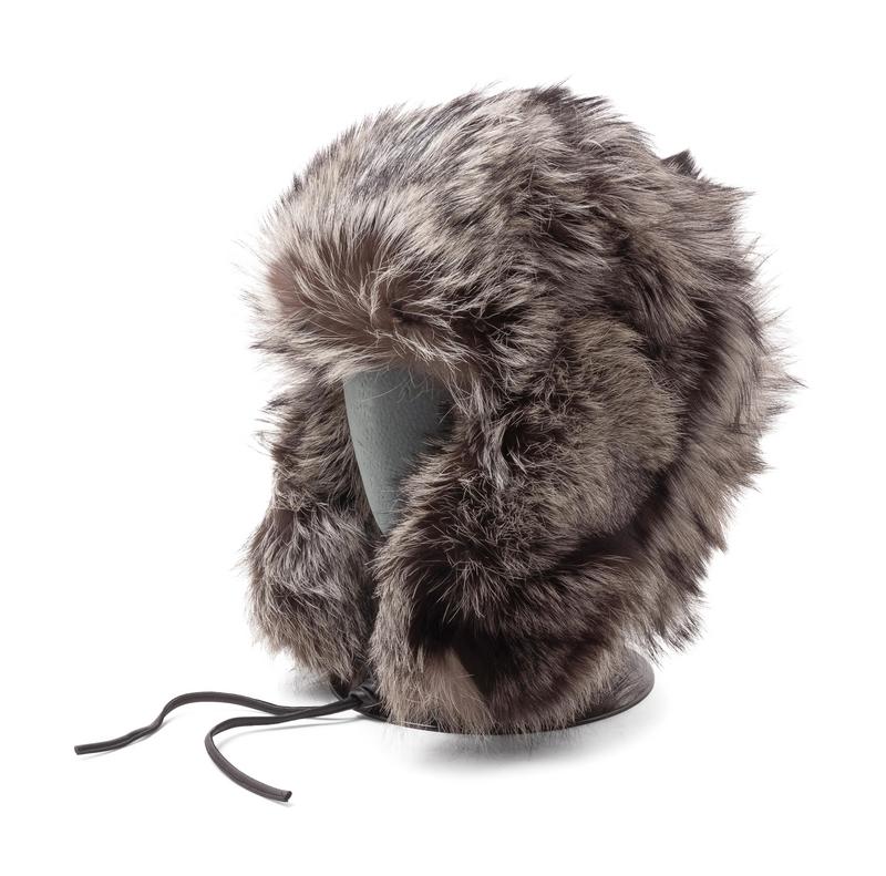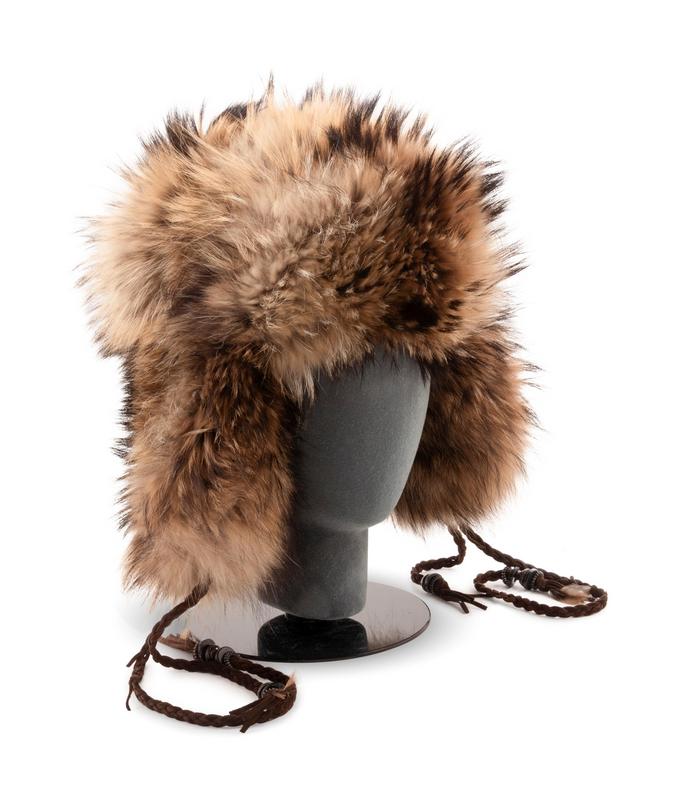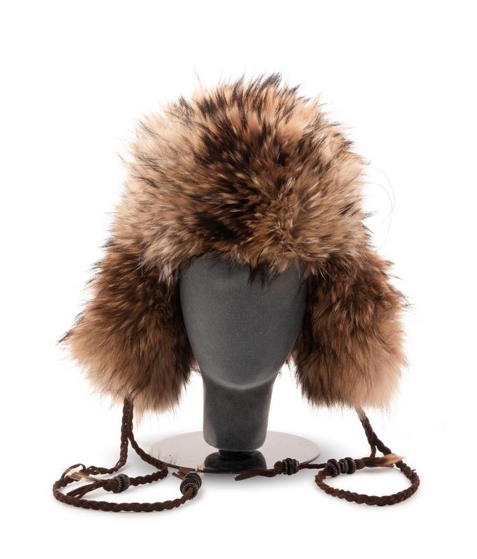 Two fox fur hats made with ear flaps . The black and white hat has black leather ties and the brown has braided brown suede ties with beads and feathers on the end.