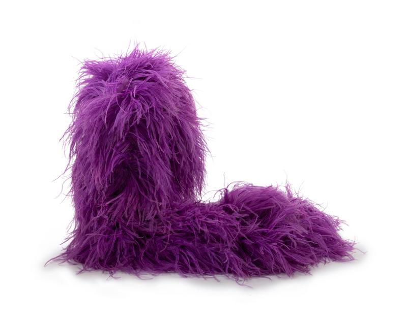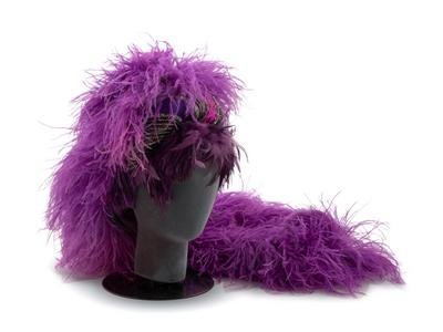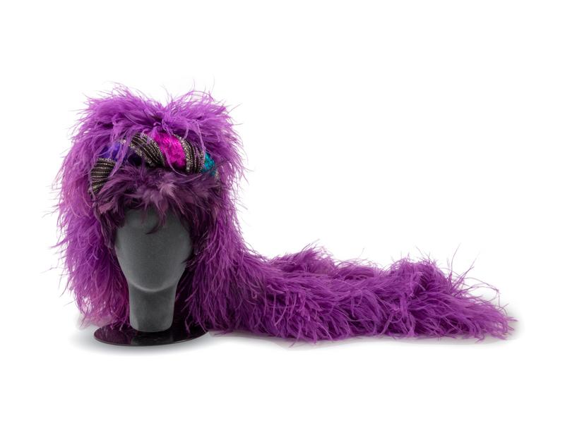 Purple ostrich feather headress with long tail and embroidery across the center front.