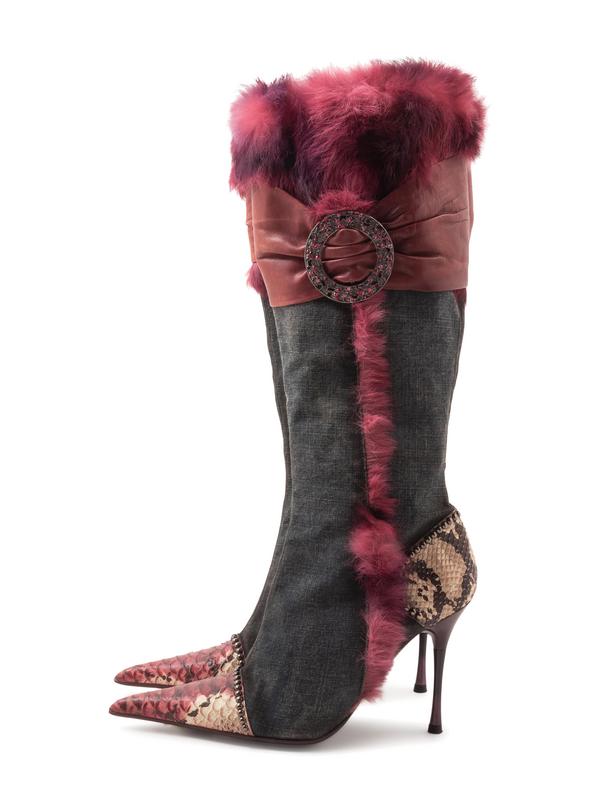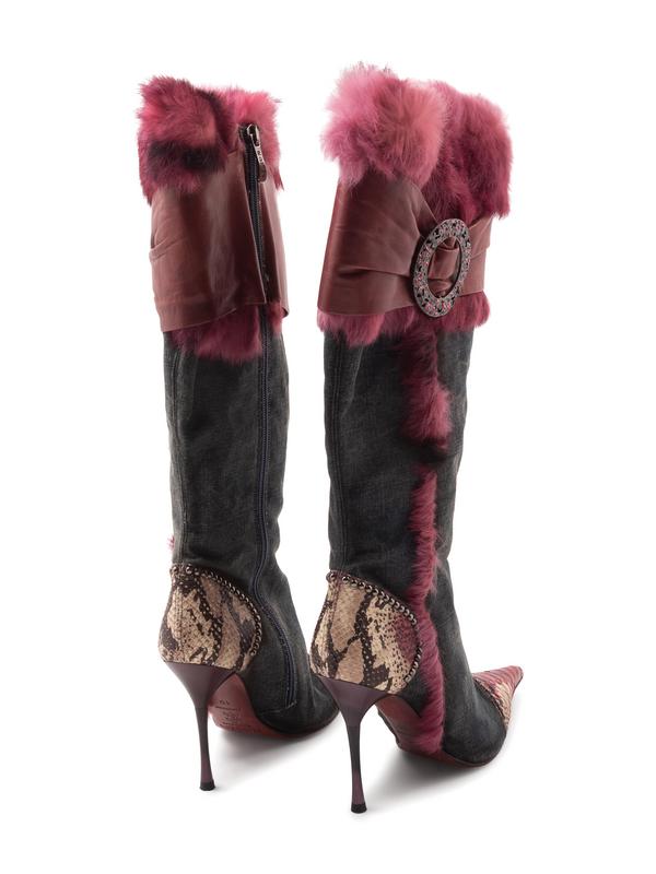 -One pair of El Dantes denim boots with snakeskin, metal studs, and pink fur, size 40