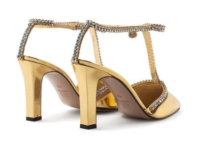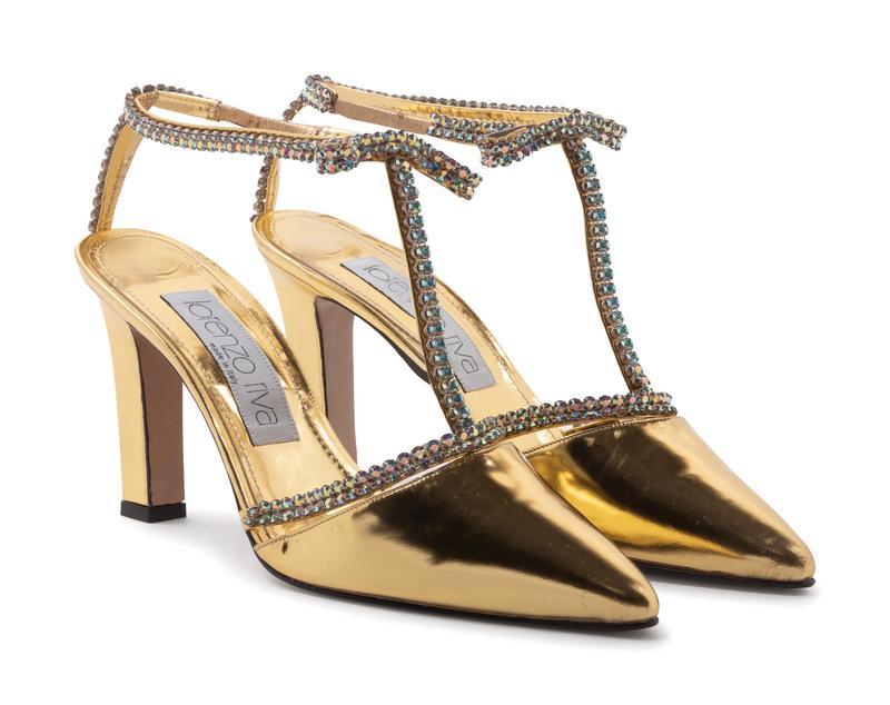 -One pair of Riva gold leather heels with rhinestones, size 40