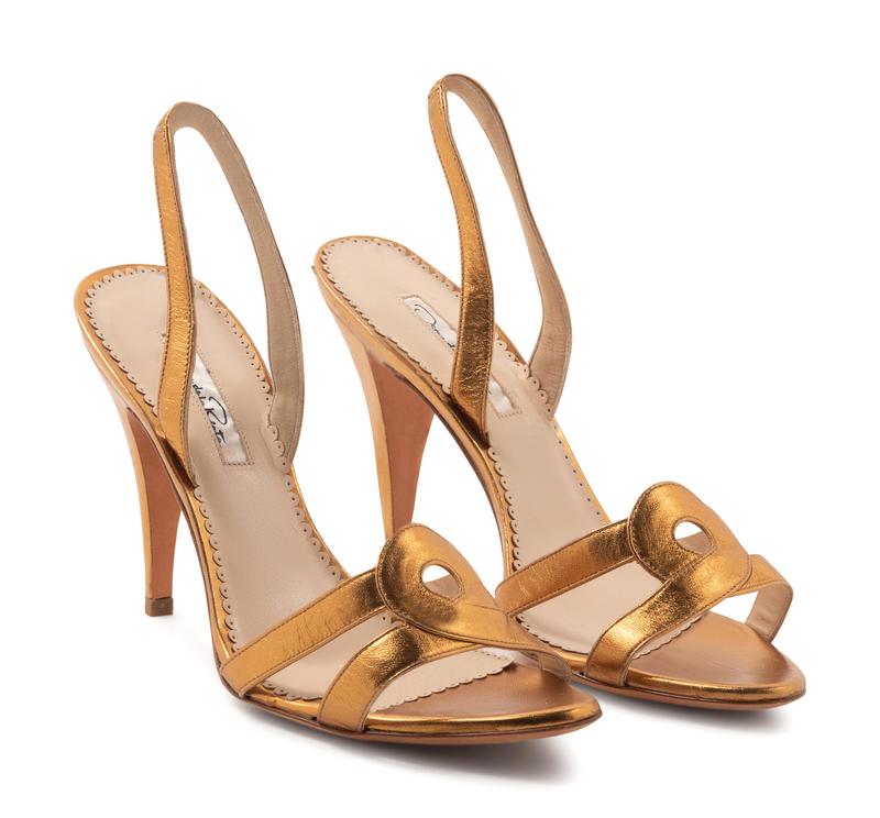 -One pair of de la Renta brass metallic leather sling back heels, size 40