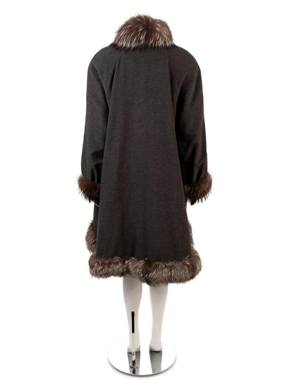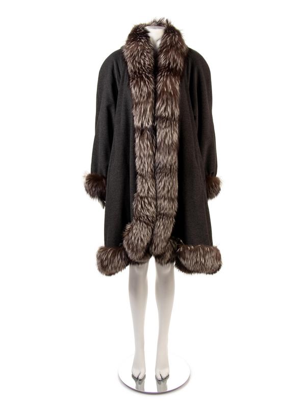 Gray wool clutch coat with ragland sleeves, lined with black silk and edged with fox fur.
