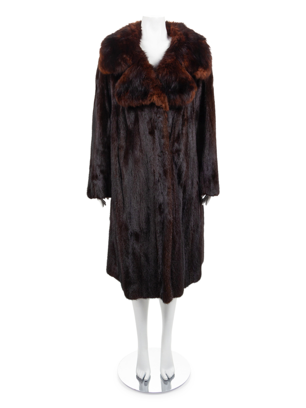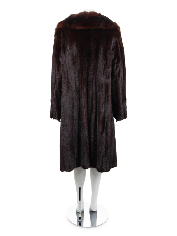 Long dark brown mink coat with notched fur collar, long sleeves and a center front hook and eye closure.