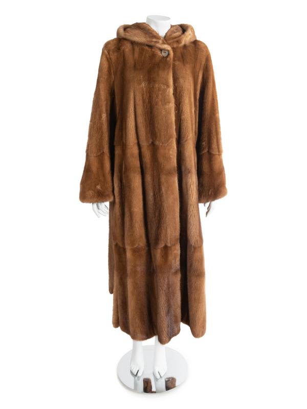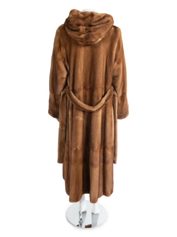 A light brown long sable coat with a design of three-tier scallops, long sleeves, detached sable belt and hood.