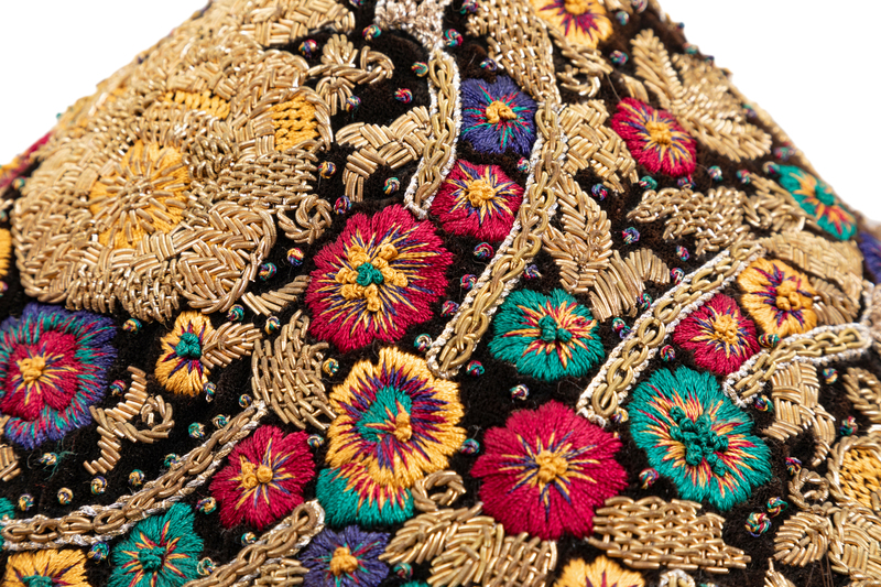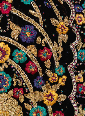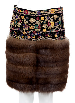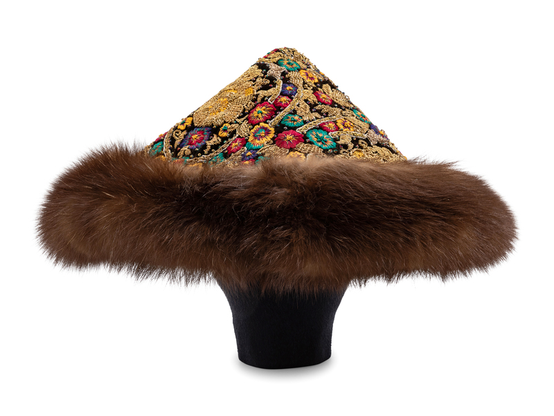 Black velour skirt suit with matching hat, featured on the cover of the catalog for Revillon's Russian themed Fall 1994 collection. Black velour jacket with heavy gold bullion and silk embroidery, Russian sable trim at collar and cuffs, and front snap closure. Matching mini skirt features straight cut, back zip closure, and 12 inches of Russian sable trim at hem. Together with matching pagoda-style hat.