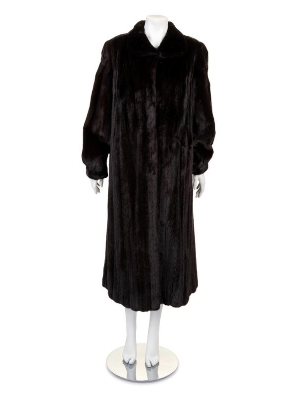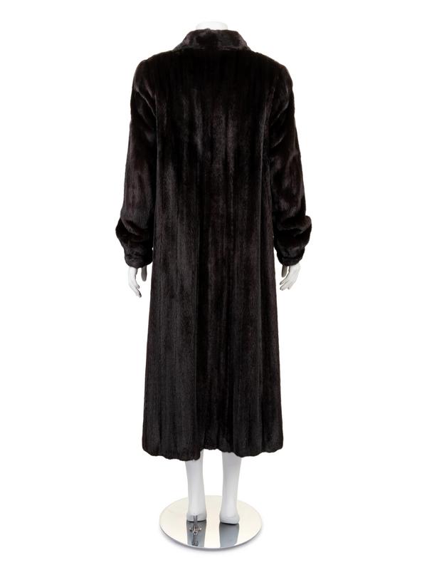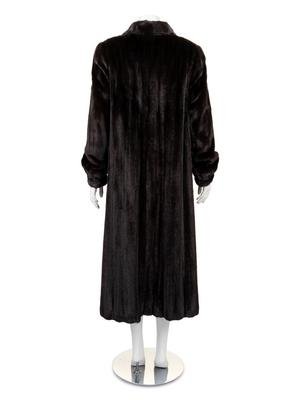 Long brown dark mink coat, with fold down collar, long sleeves gathered into a cuff, with center front hook and eye closure.
