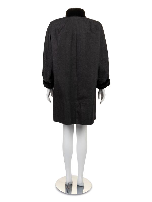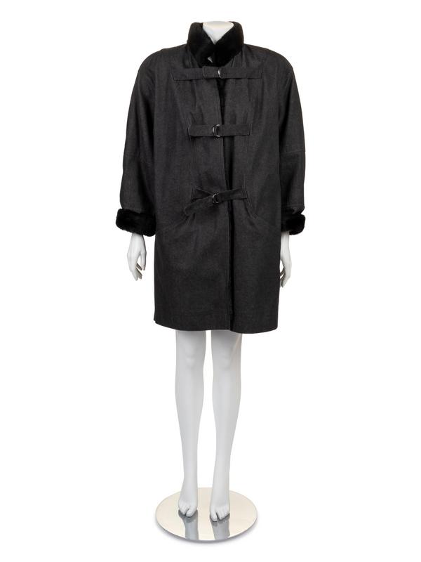 Black denim coat with long sleeves and a center front closure. Coat is lined with blacked shaved fur and has a stand collar and turned back cuffs.