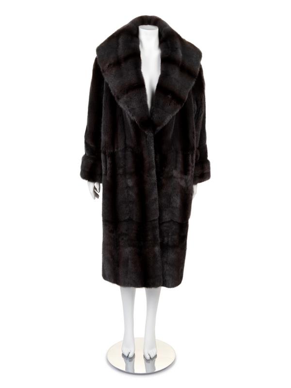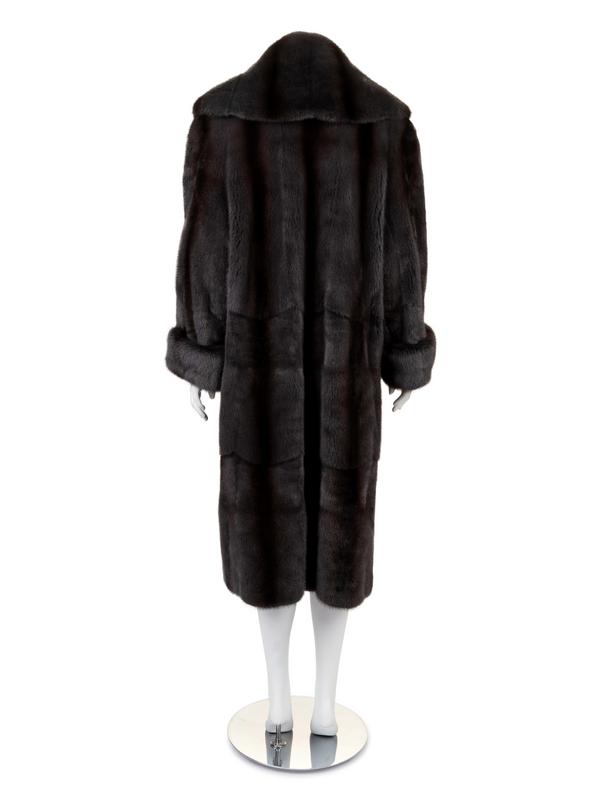 Gray mink coat with wide shawl collar, long sleeves with cuff, and center front hook and eye closure.