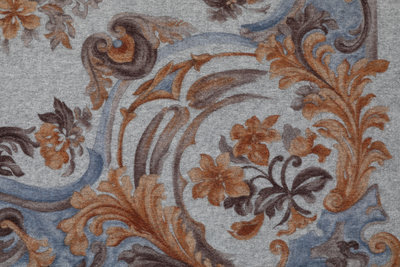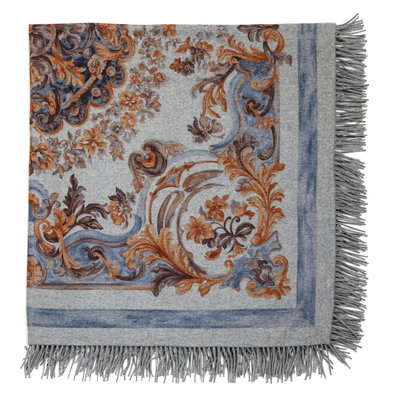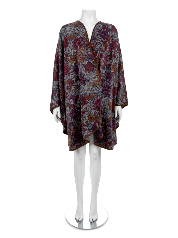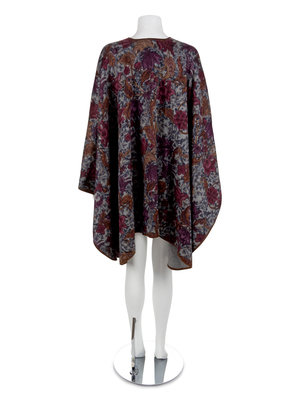Gray with multi-hued floral print cashmere poncho with rounded corners and trimmed with brown suede.