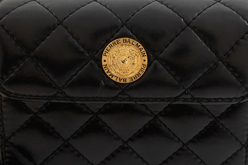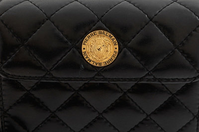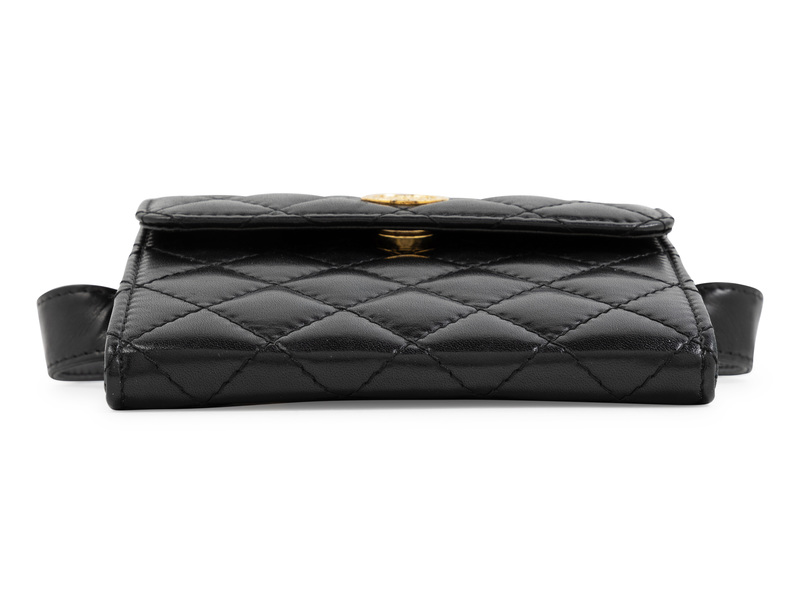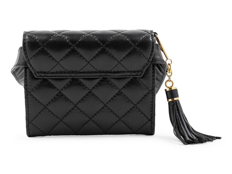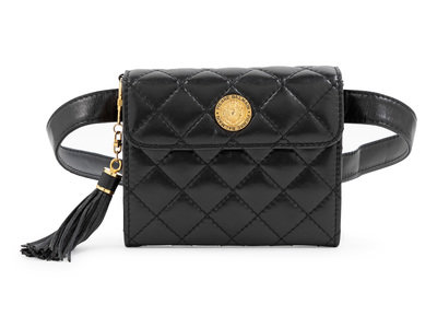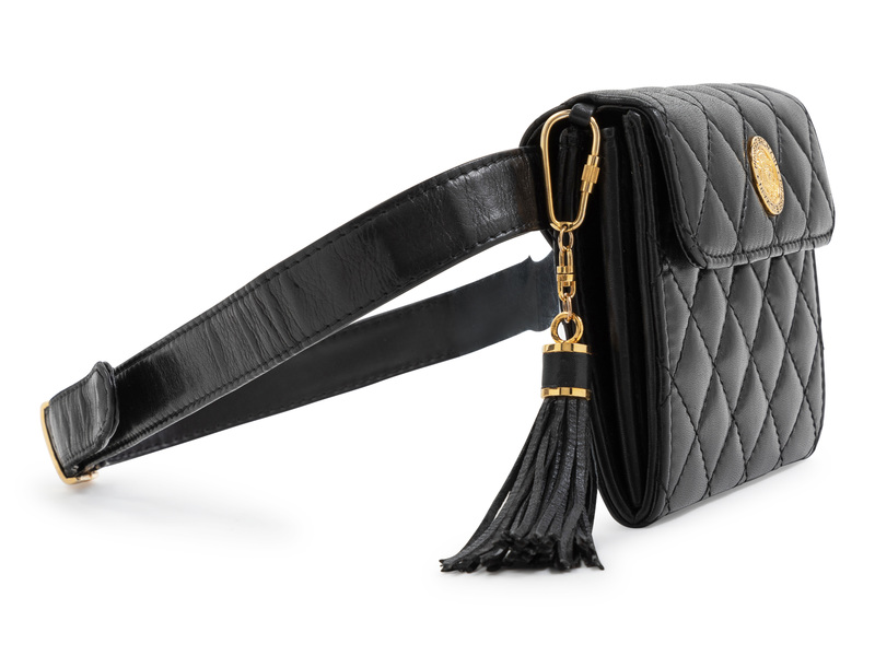 Quilted black leather bag trimmed with goltone hardware and attached to a black leather belt.