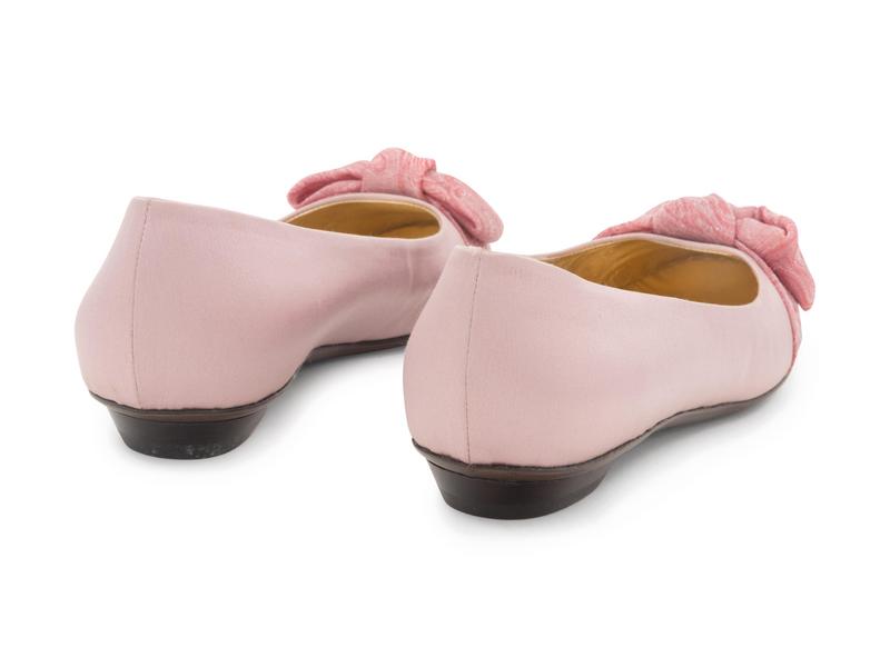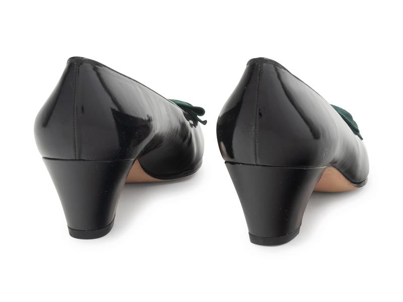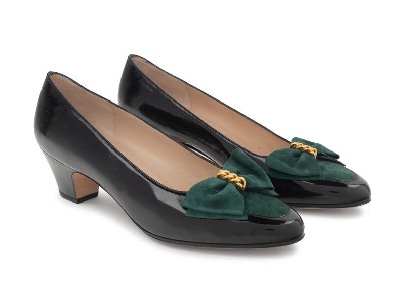 Black patent leather with a green suede bow over each toe and finished with a goldtone chain. Appear unworn.