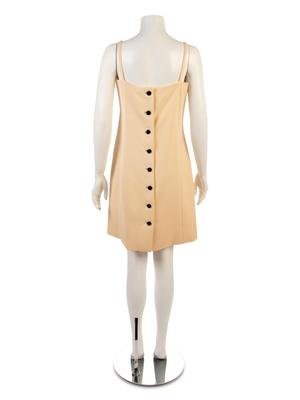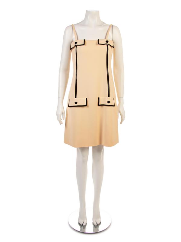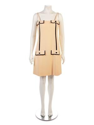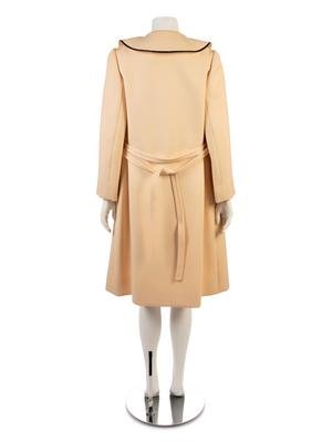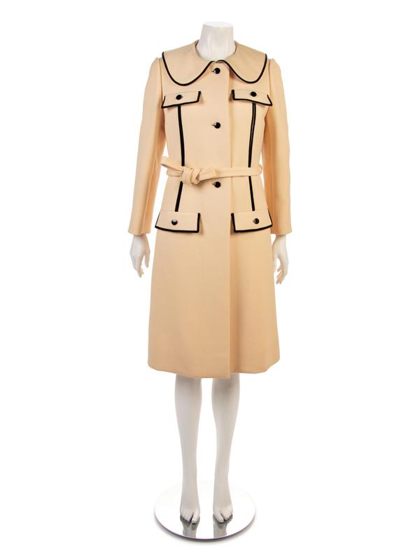 Two piece ensemble of cream wool edged with black wool. Dress is made with thin straps and four decorative pocket flaps on front and closes down center back with buttons. A belted coat has a peter pan collar, long sleeves, four decorative pocket flaps on front, and closes down center front with buttons.