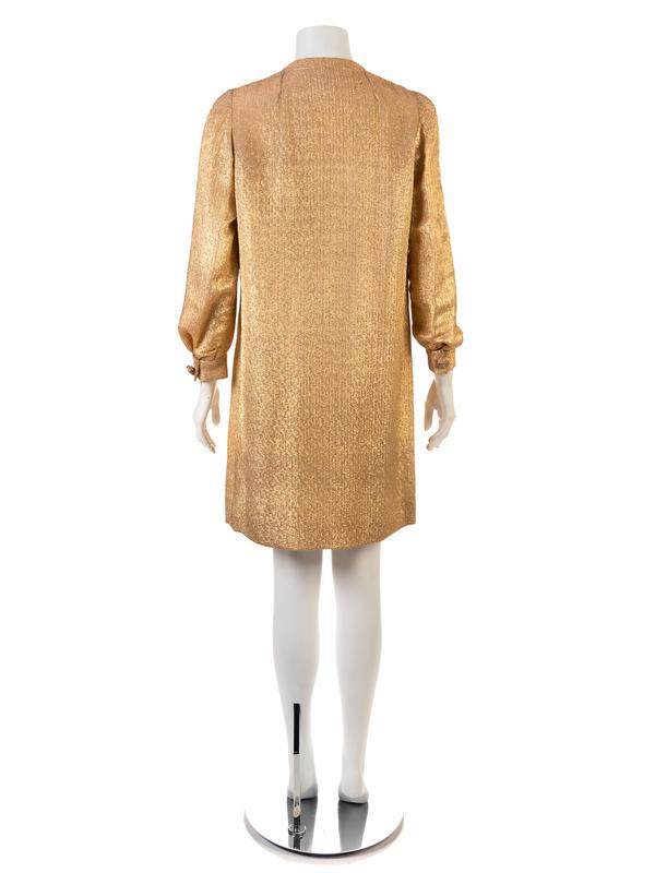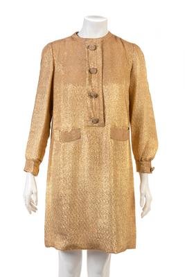 Gold metal thread dress with long cuffed sleeves, center front button placket to waistline and pockets over each hip.