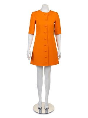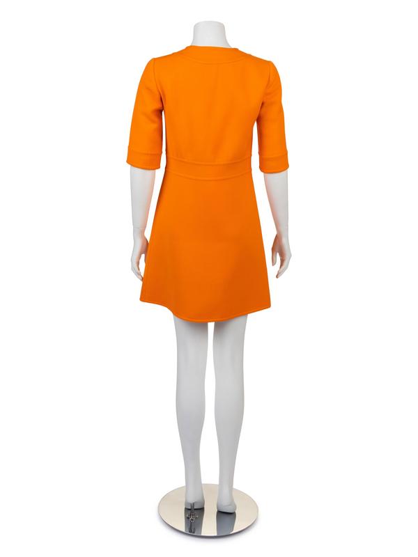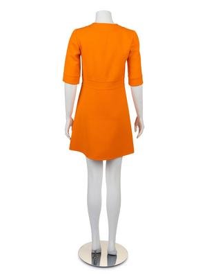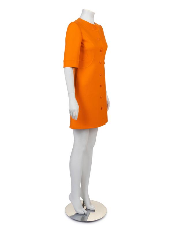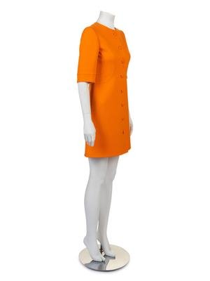 Orange wool dress with crew neckline, short sleeves, and center front button closure.