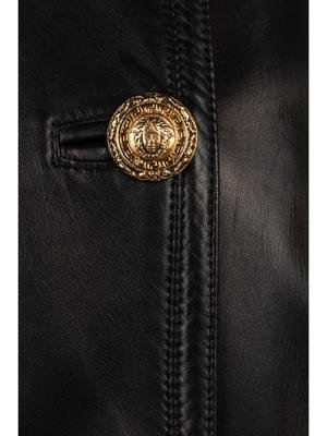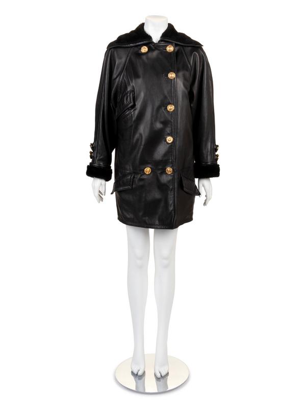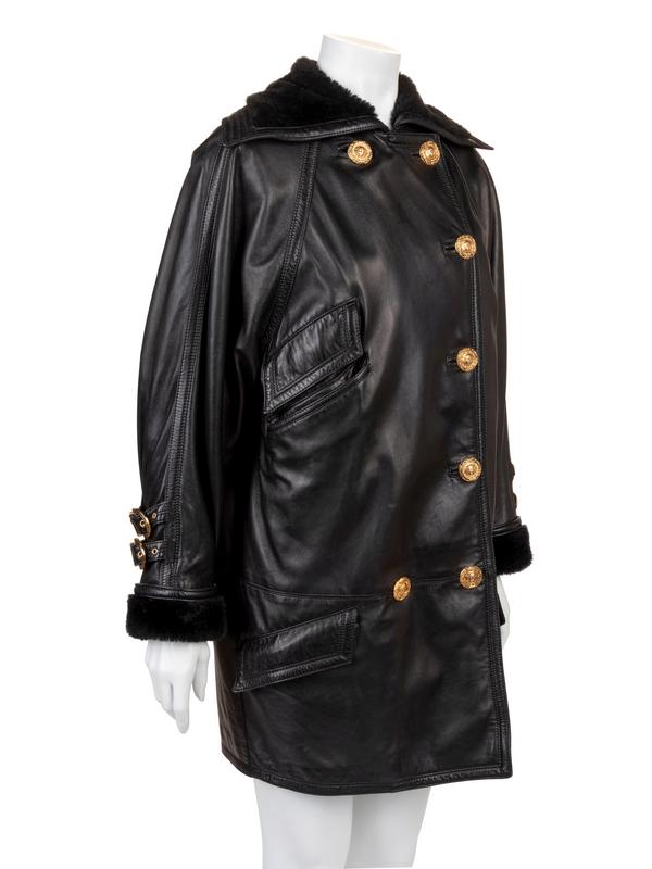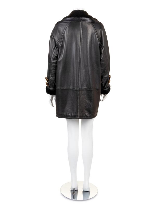 Black leather coat trimmed with black plush at collar and sleeve hem and finished with goldtone hardware on sleeve hem and on button closure. The buttons down the center front feature a Medusa head surrounded by the Greek key motif.