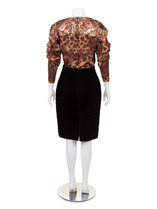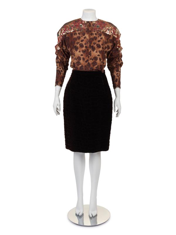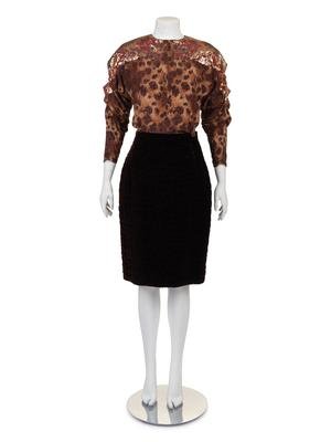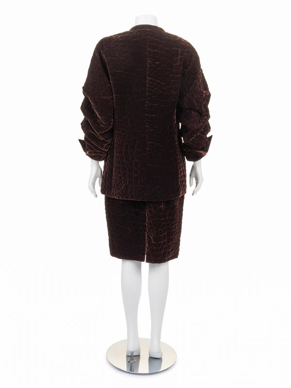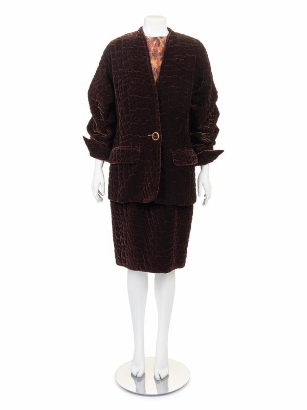 A jacket and skirt made of quilted brown velvet. Jacket with no collar and gathered ragland sleeves with a center front boutton closure. Straight skirt has no waist band with center back zip. Shirt has animal print with gold silk print on shoulder.